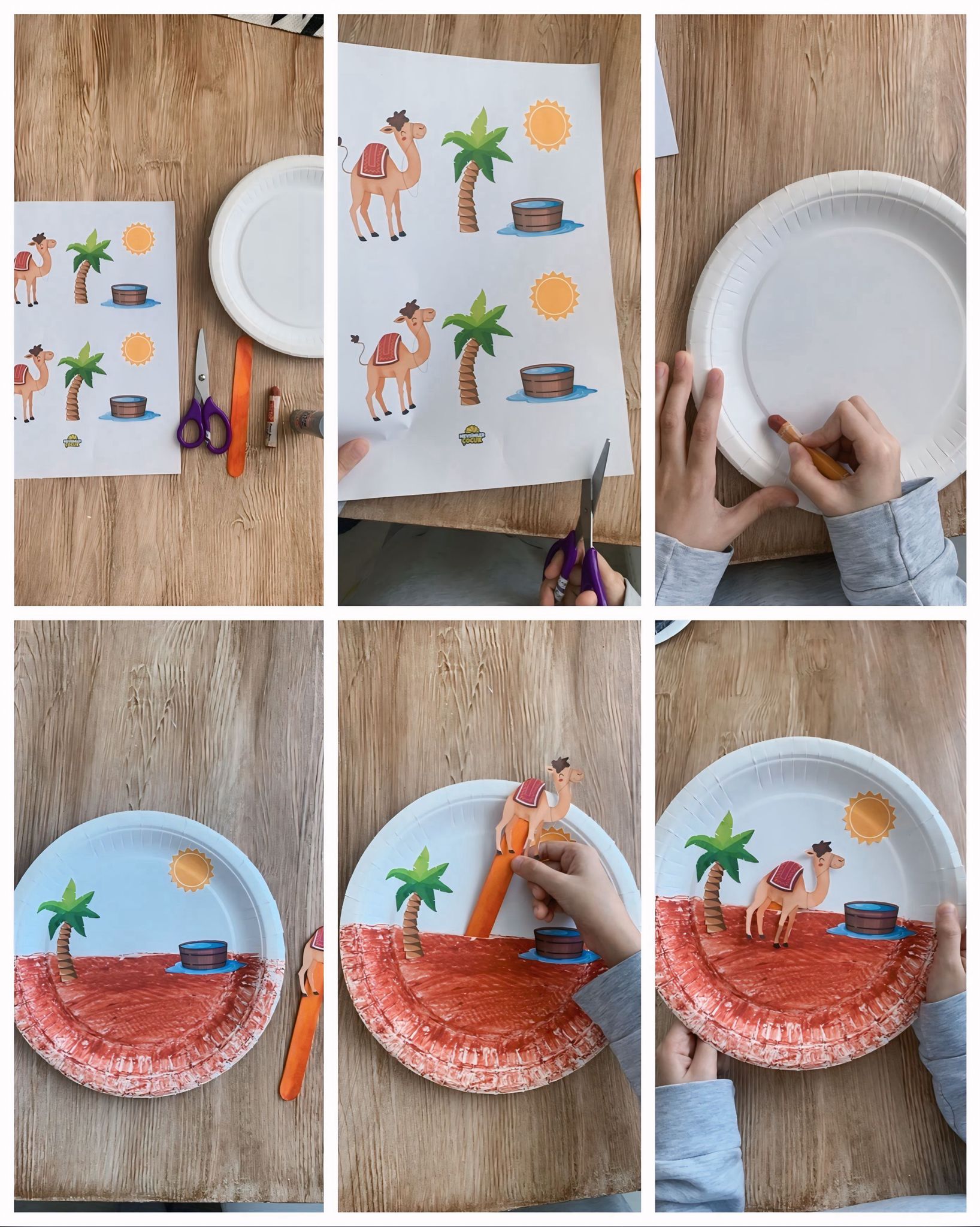- A4 çıktısındaki deve, güneş, ağaç ve su kabı görsellerini tek tek kesin.